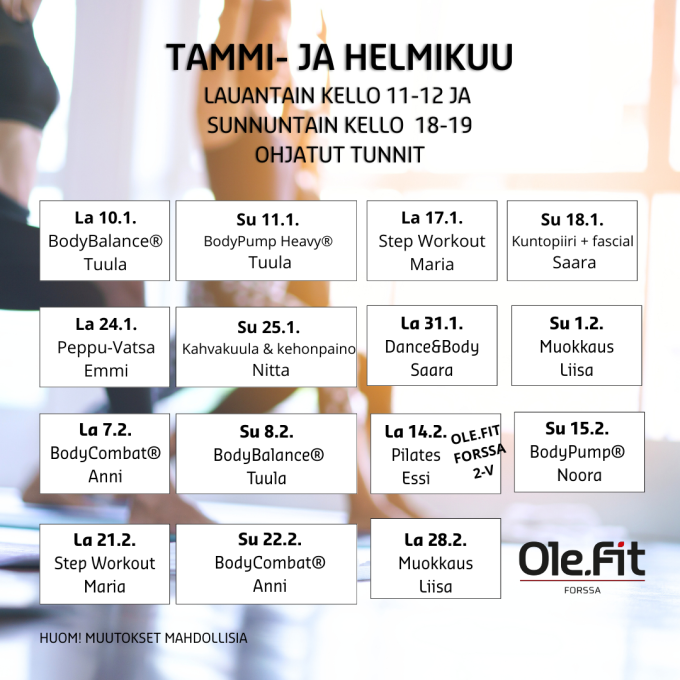 Ole.Fit Forssan ryhmäliikuntasali on iso, avara ja valoisa, jossa jossa riittää tilaa ja happea kaikille liikkujille. Ryhmäliikuntatuntimme on suunniteltu kaikille, oli kuntoilutaustasi mikä tahansa. Ohjaajamme opastavat sinua aina vaihtoehtoisilla liikkeillä, jotta voit treenata juuri omalla tasollasi.